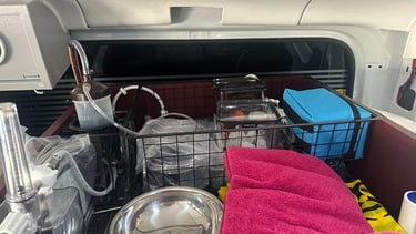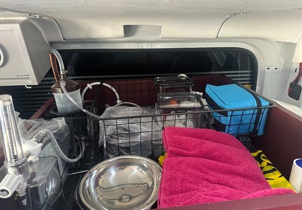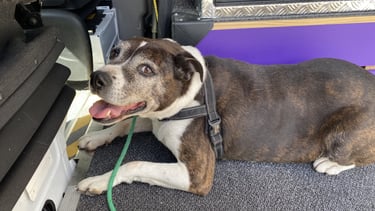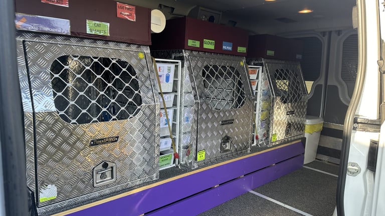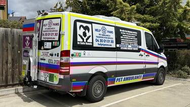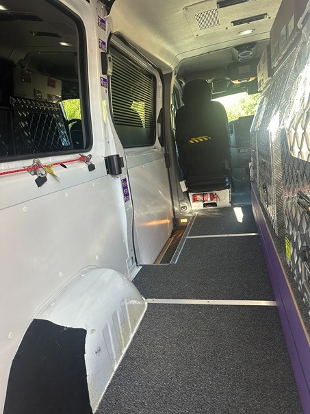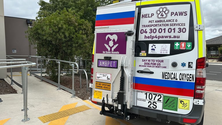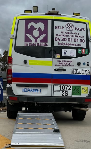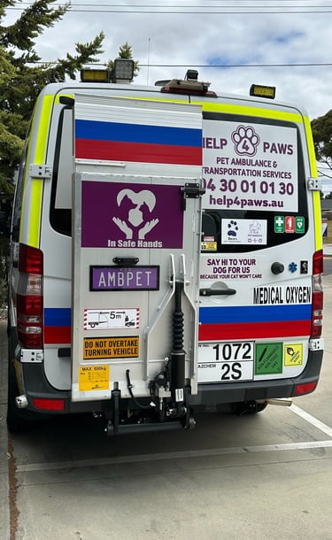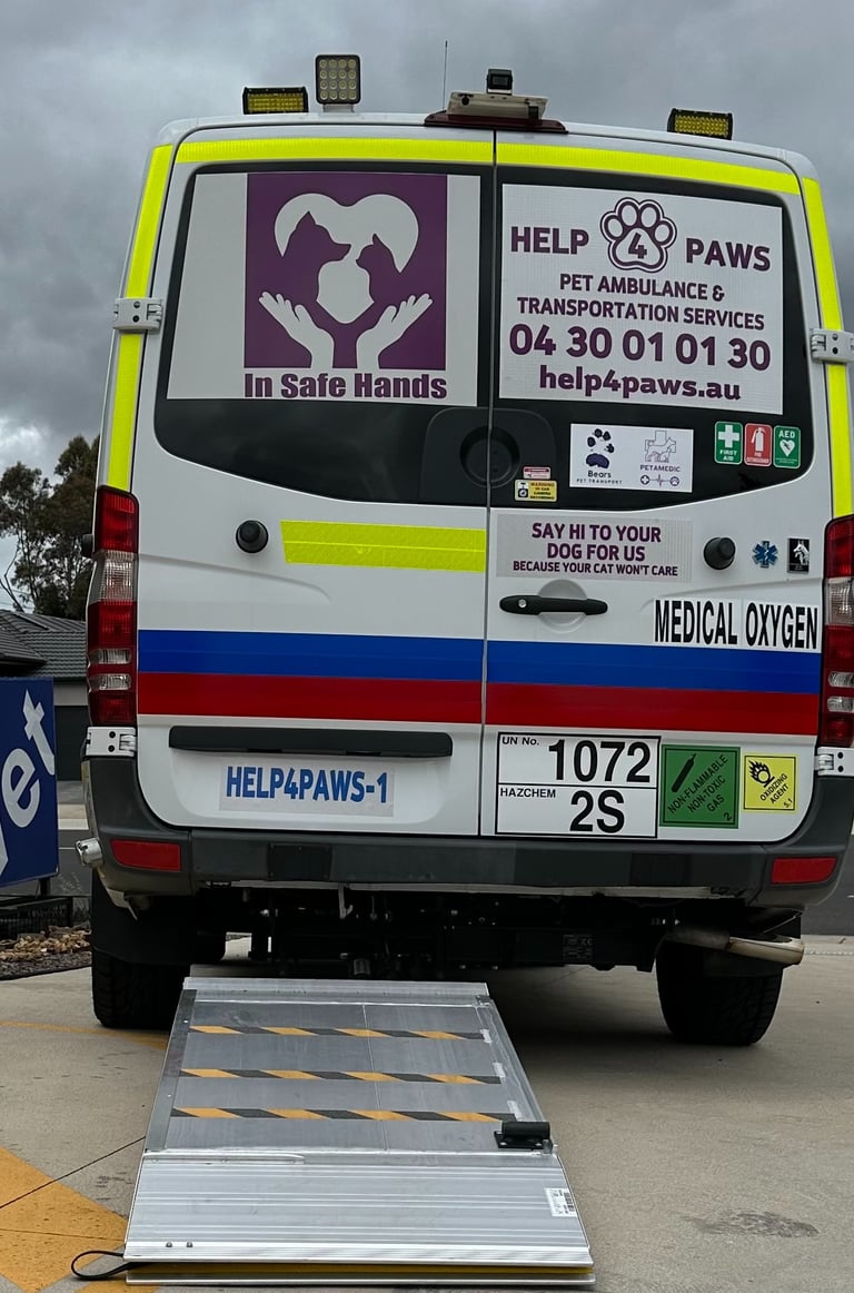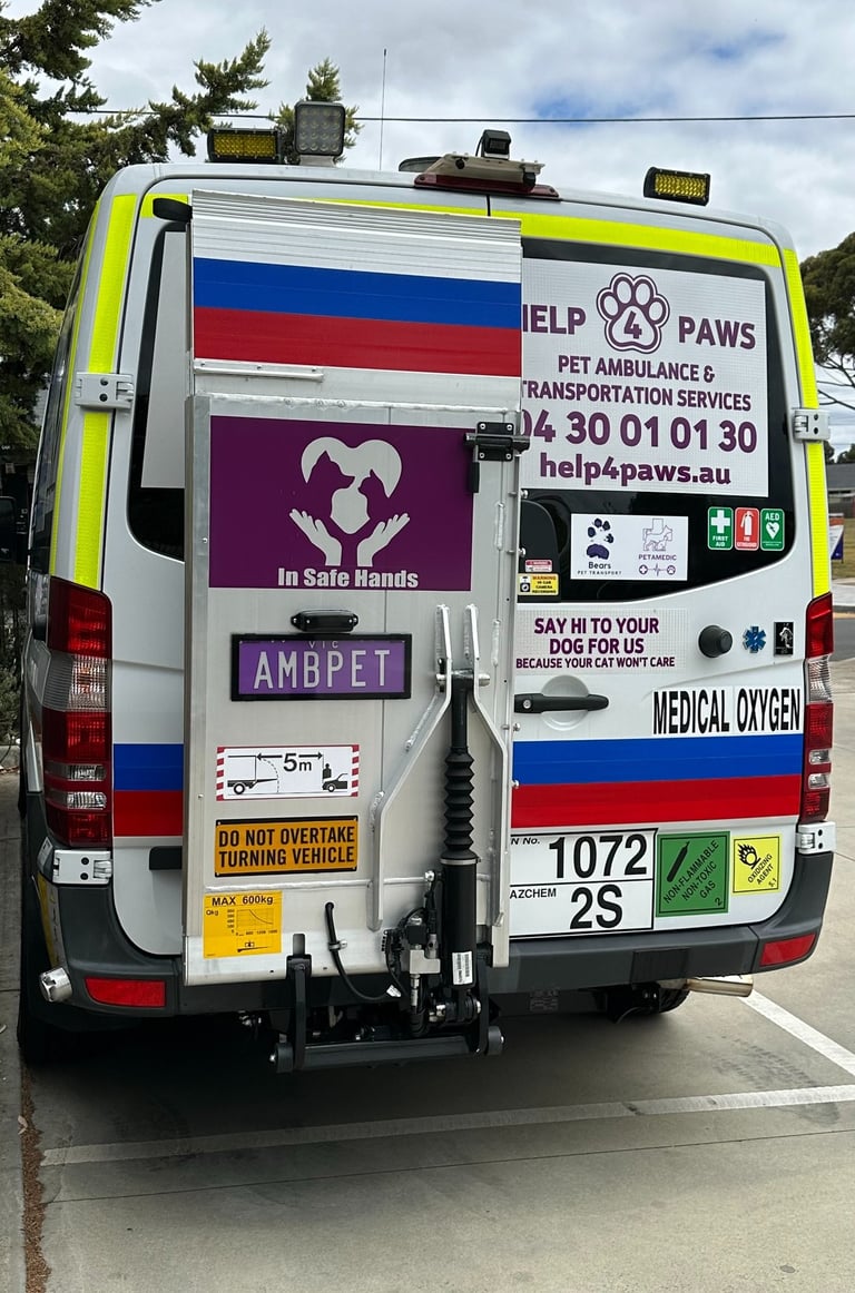 The hydraulic lift on the back of the ambulance can hold 600kg. It is used for larger breeds of dogs who are unwell or lame. Little did we realise how important it would become to some of our patients and their owners.